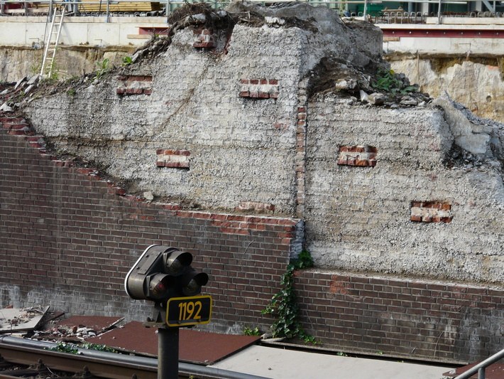 waarbij tussen de keurig gemetselde schillen bakstenen in