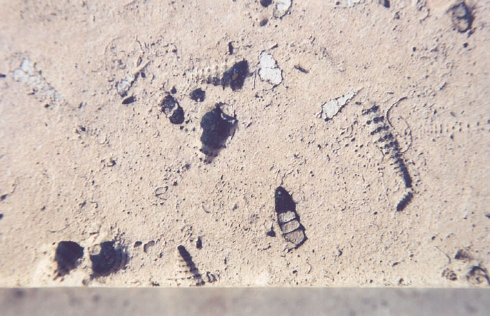 Paris (= Parijs, F) - Panthéon: bovenzijde van trede van de trap voor de voorgevel, kalksteen met schelpfossielen