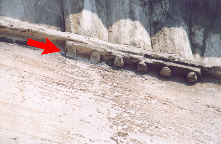 maar dan wel een aantal rijen achter elkaar, tot de hele mutulus 'bedruppeld' is.