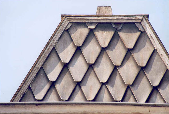 Door de grijze verwering van het zink kunnen de losanges uit de verte op leien lijken.