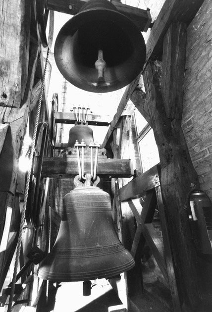 de klokken aan een balkje hangen, dat opgelegd is in de muren.