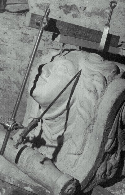 Het model is van klei of gips, òf het is een oud beeld waaraan ontbrekende delen