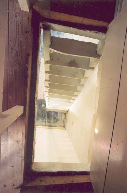 aan weerszijden van het trapgat die de raveelbalk dragen, zijn