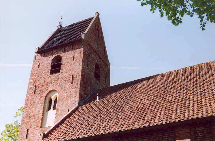 De nokken van de zadeldaken van kerk en toren wijzen meestal in dezelfde richting.