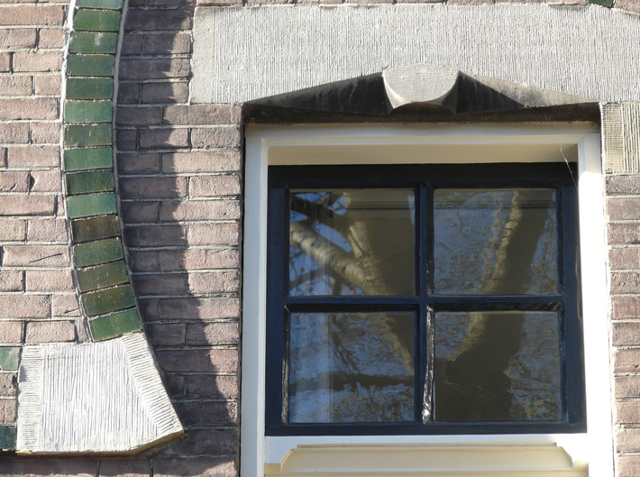 , detail voorgevel met aanzetsteen van de hoefijzerboog en bovenraam van het linker venster