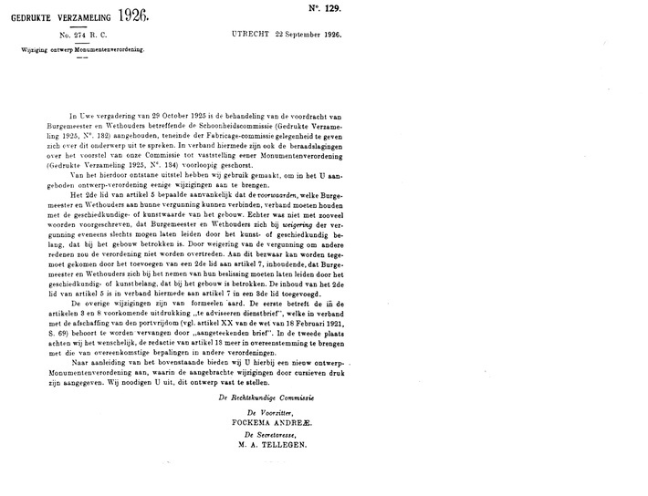 Gedrukte Verzameling 1926, nr 129: "Wijziging ontwerp Monumentenverordening"
