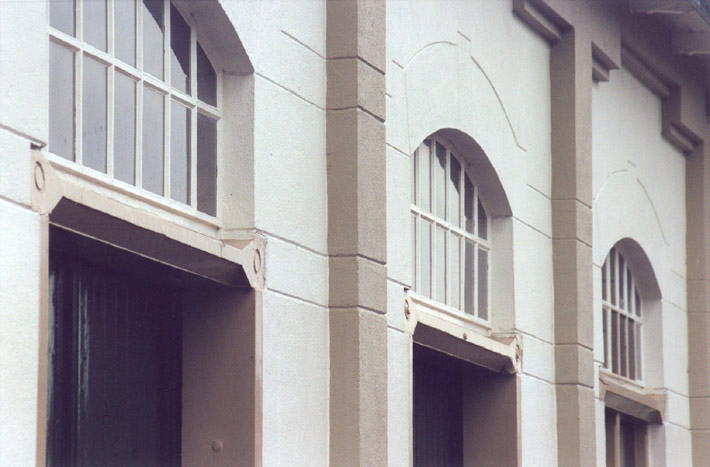 Nijkerk - Station: linker deel voorgevel, dorpelbanden in pleisterwerk met schijnvoegen