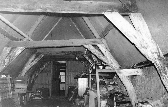 : zolder naar voren toe gezien. Schaarspanten met krommers en korbelen, met een fors blokkeel gekoppeld aan de voetplaat