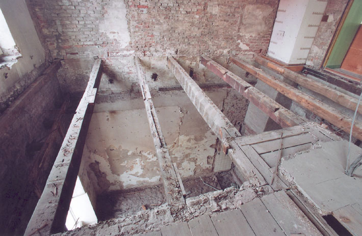 : linker middeleeuwse huis, achterste gedeelte. Gezicht vanaf verdieping op balklaag boven begane grond. Enkelvoudige balklaag van het achterste vertrek met deels hergebruikte balken