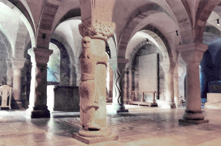 Lund (S) - Domkyrka: crypte met statue-colonne, Samson die de schacht omvat