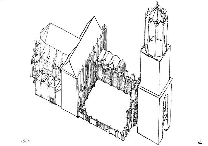 Omschrijving: Utrecht - Domplein - Dom, rond 1682 na opruiming van sommige delen van de ruïne en het dichtmetselen van alle opengevallen scheibogen