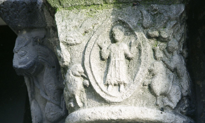 Poitiers (F) - Saint-Porchaire, westportaal, rechterzijde, rechter kapiteel, voorzijde: Daniël (in mandorla) in de leeuwenkuil