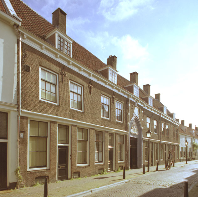 Utrecht - Springweg met het complex uit 1612 en 1619 (Springweg 100 - 108); in het midden de Weeshuispoort (Springweg 102)