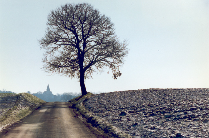 België: weggetje bij Sovet (provincie Ardennes) met markante boom
