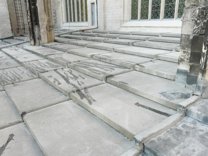: dakbedekking kooromgang: natuursteenplaten (en lood op voorgrond)