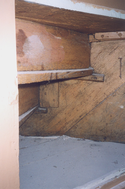 : spiltrap: trapkastje onder deel naar de zolder, binnenkant met achterzijde onafgewerkte treden