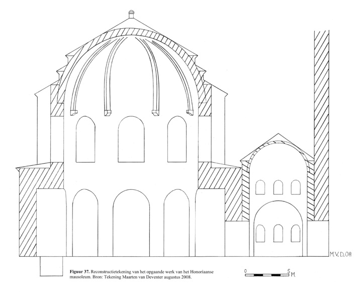 Opmerkingen: Tekening is gepubliceerd in: Deventer, Maarten van, 'Etiam periere ruinae', Zelfs de ruines zijn verdwenen. Een reconstructie van het verloren gegane grafmonument van het Honoriaanse keizerhuis. Scriptie Universiteit Utrecht, nr S0523828. Utrecht, 2008. [69 blz. ISBN -], blz. 69