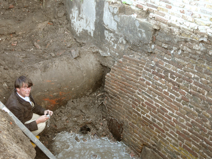 : bouwhistorisch onderzoek onder het huidige maaiveld rond de vroegere spuisluis van de Siepelbeek: de rioolbuis ligt in de oude bedding van de beek