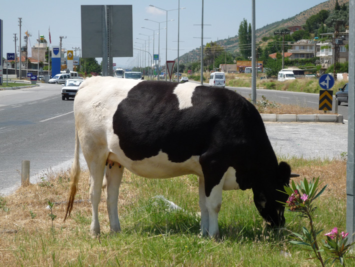 Vierbaansweg, met in de middenberm grazende koe (Söke, TR)