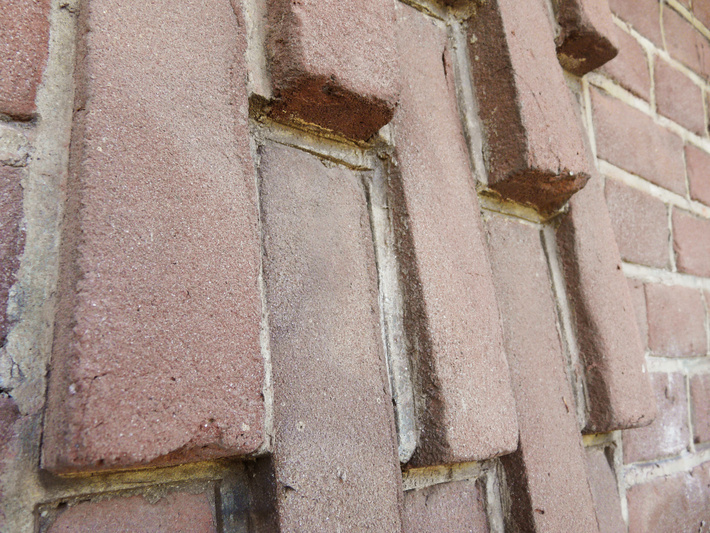 na ontmanteling deel voorgevel: reliëfmetselwerk