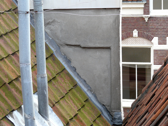 , loos lijstgeveldeel van de voorgevel, van achter gezien, met herkenbaar een trede van de oorspronkelijk trapgevel
