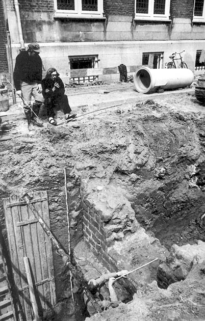 Opgraving van een gedeelte van de Romeinse castellummuur uit 160 na Chr. aan het Domplein/Voetiusstraat. De muur wordt doorbroken bij de aanleg van een nieuw riool. De hap uit de muur is van het oude riool