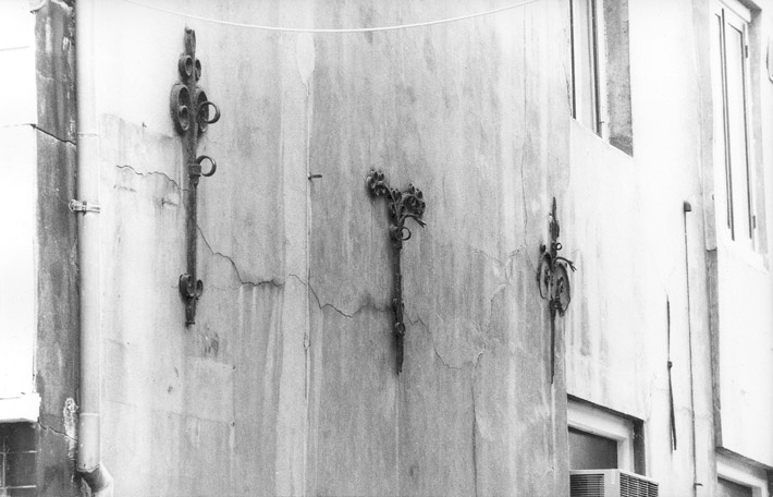 , rechter zijmuur in de Wijde Watersteeg met 4 muurankers tussen begane grond en eerste verdieping (links: hoek met Twijnstraat)