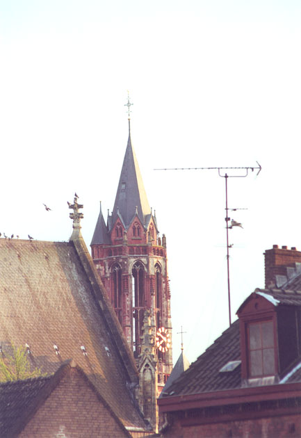 Maastricht - Sint-Janskerk, Ned. Herv.- (midden) en Dominicanenkerk (links) gezien vanaf het bordes van het Stadhuis
