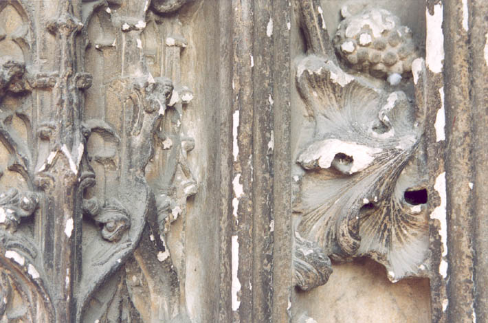 : detail zuidportaal, dagkant met links wimbergen en pinakels met hogels, rechts wijnstok