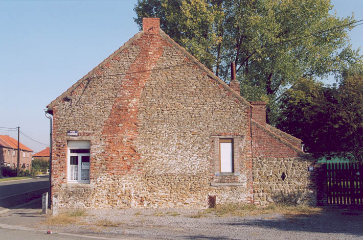 opmerkingen : Pommeroeul (Bernissart, Hainaut, B), Rue d'Harchies 35, breuksteengevel met bakstenen rookkanaal