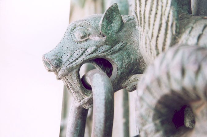 : portaal voorgevel, bronzen deur, rechter vleugel, 4e rij van onder, linker paneel, detail grote deurklopper
