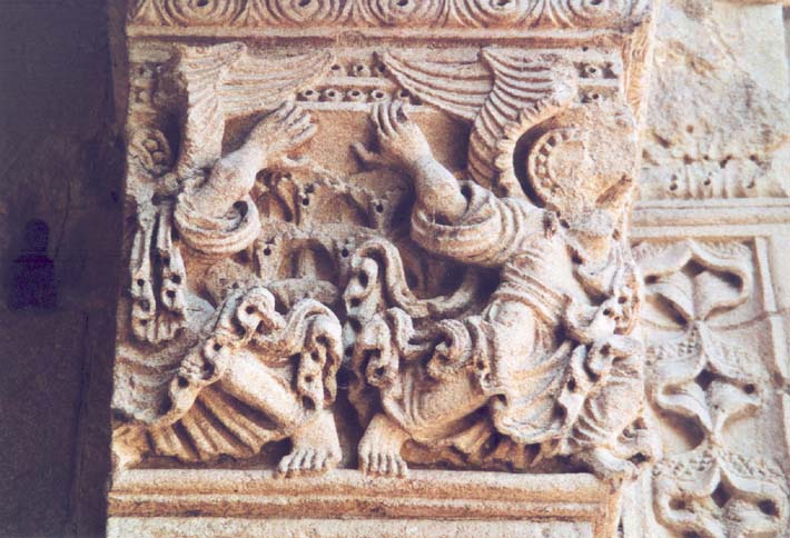 , noordgevel van de narthex, detail van het grote portaal, rechter kraagsteen onder de latei