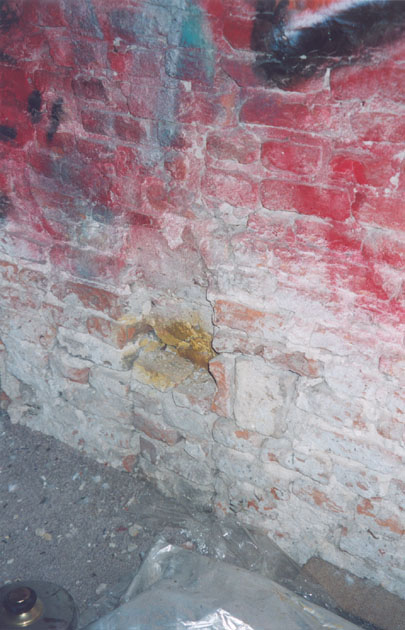 -32: achterste beuk, linker bouwdeel, 2e verdieping. In de borstwering (voorzijde) van de voormalige zolder is de ommetseling van een spantbeen te zien