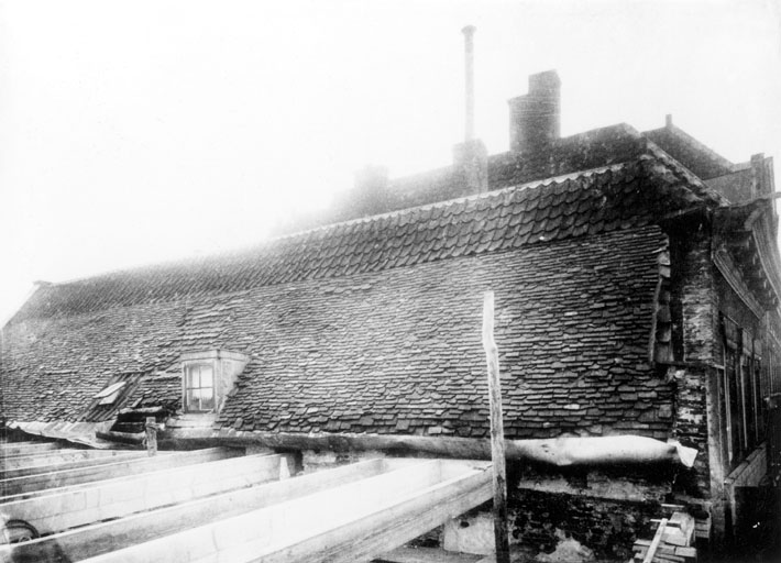 , grotendeels nog voorzien van daktegels. Op de voorgrond de balken van