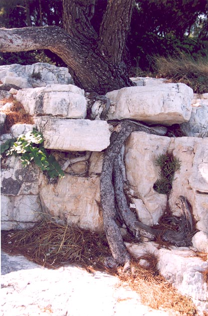 , rotsen, opzijgedrukt door de wortels van een boom