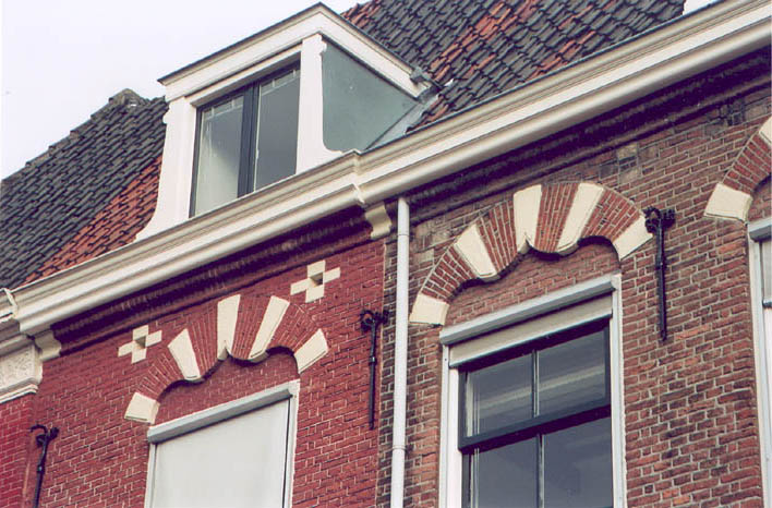opmerkingen : Utrecht - Korte Nieuwstraat 4 en links een bij nummer 2 getrokken travee. Korte Nieuwstraat 2 heeft rood geschilderd baksteen en gebroken wit geschilderd natuursteen. Nummer 4 heeft alleen de natuursteenblokken geschilderd, met uitzondering van de vogelgaten, waardoor die kruisvorm rechts bijna wegvalt.