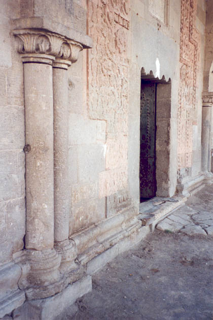 Derinkuyu (TR) - Armeense kerk: hoofdingang, met om de as draaibare zuilen aan weerszijden van de ingang. De kapitelen en schalken zijn vast en bevatten een pen waardoor de schacht kan draaien