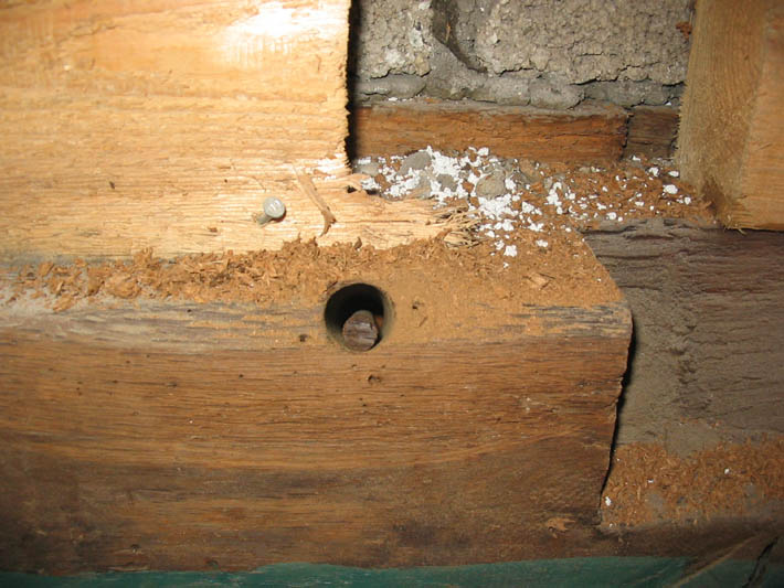 , dendrochronologisch onderzoek. Na het terugtrekken van de holle boor blijft in het midden een ronde staaf over, die er voorzichtig uitgehaald wordt