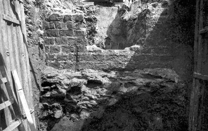 Opgraving van een gedeelte van de Romeinse castellummuur uit 160 na Chr. aan het Domplein/Voetiusstraat. Foto is genomen voor de afbraak. Onder de muur enkele (3?) lagen wisselend puin en mortel