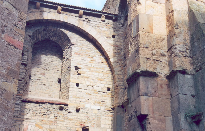 : zuidgevel koor tussen grote (links) en kleine transeptarm (rechts) uit zuiden gezien