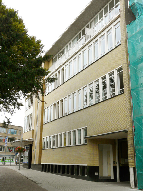 , gGebouwd 1933-1935, architect: W.M. Dudok. Betonskelet, aan de buitenzijde bekleed met gele tegels. Aan de zijde van de afgeronde hoek volgde in 1945 een uitbreiding. Gevel aan de Tuinlaan.