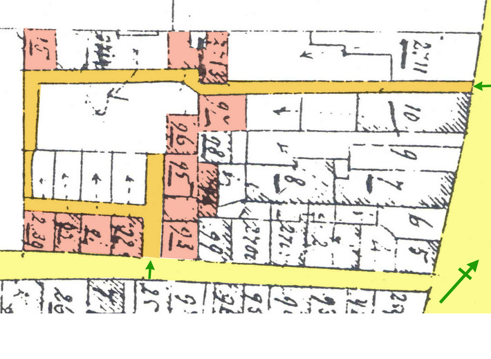 Rond 1832 omvatte het slop, van links onder tegen de klok in, de panden: