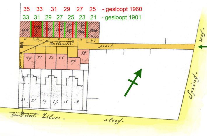 Het te slopen pand Springweg 31 (oud adres) is donkerder rood gekleurd