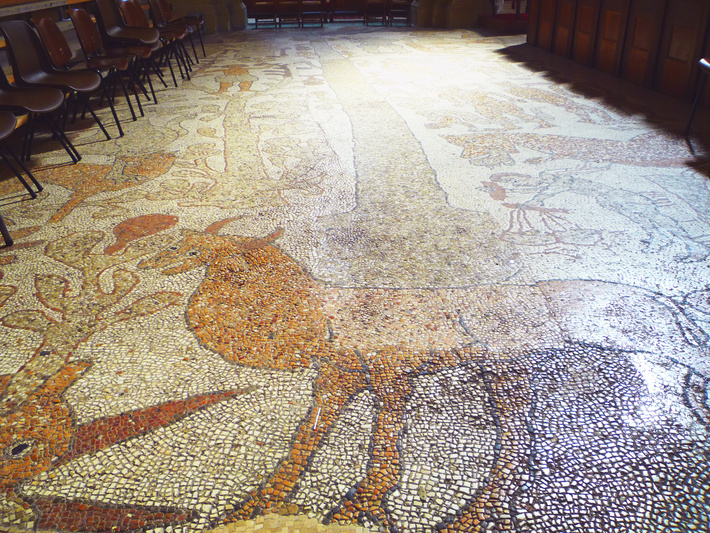 , mozaïekvloer (1163-1165), linker zijbeuk, het begin van het mozaïek uit het westen met dier dat de levensboom draagt