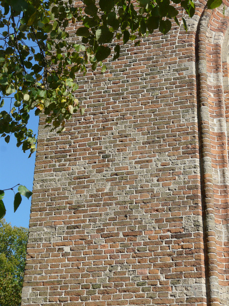 , toren, westzijde met metseltekens, uitgevoerd in tufsteen