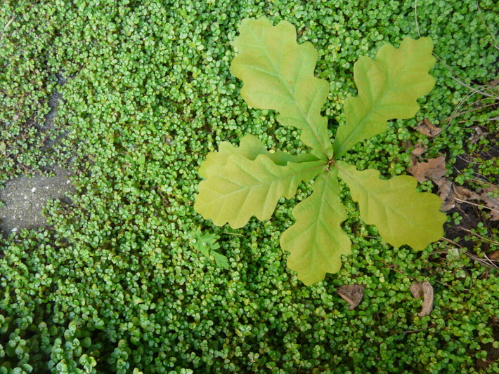 Heel jong eikenboompje van boven gezien (in Utrecht)