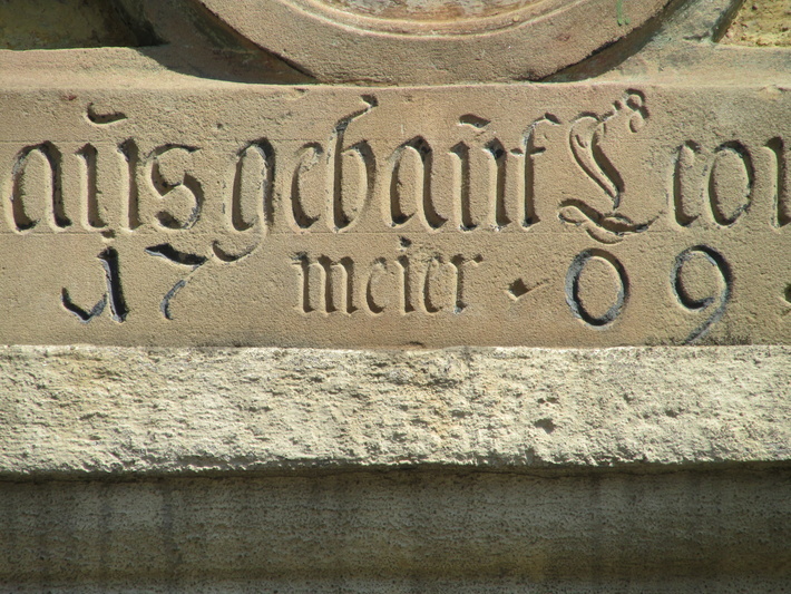 Leutershausen (D) - Am Markt 13, voorgevel: gedeelte van samengestelde "gevelsteen" boven de ingang met onder meer een inscriptie met het jaartal 1769.