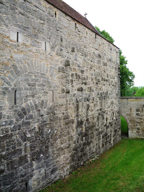 Rothenburg ob der Tauber (D) - stadsmuur - Klingentor, de barbacane, gezien van de veldzijde, met de noordgevel van St. Wolfgang
