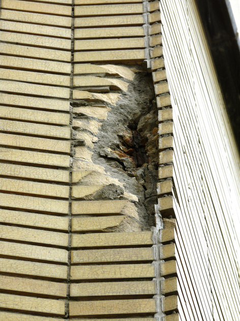 , gevel aan de Tuinlaan met betonrot onder de gevelbekleding met tegels