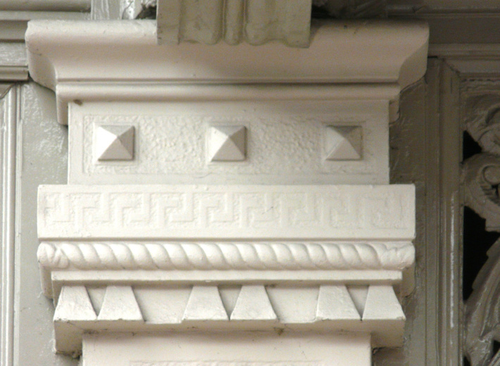 , frontgevel, kapiteel-achtige pilasterbeëindiging naast de ingang